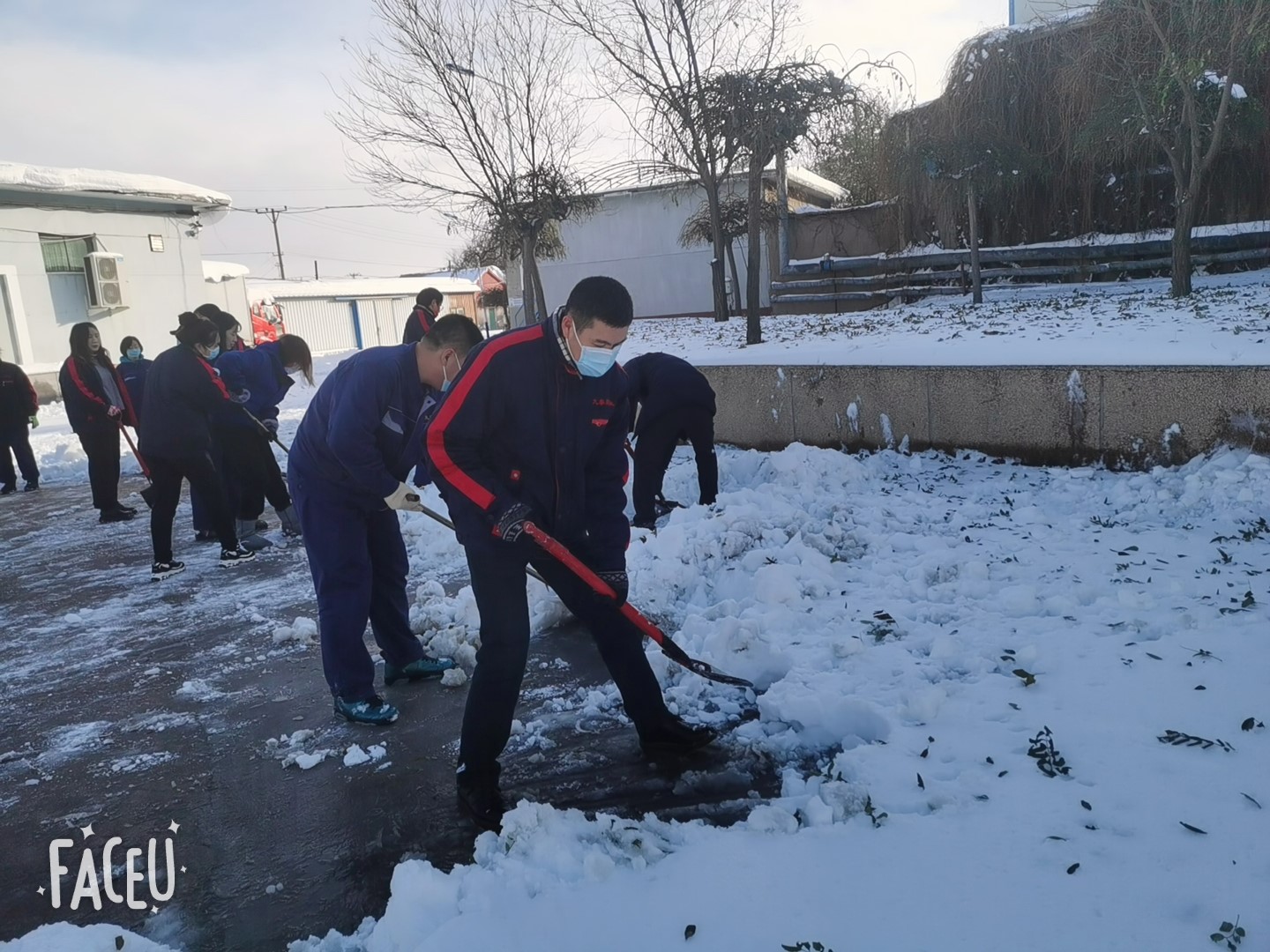 踏著厚厚的積雪,大家不畏嚴(yán)寒,積極主動(dòng),在郭總的現(xiàn)場(chǎng)指揮下全力以赴地投入到掃雪工作中。包裝中心員工在郭崇、劉斌帶領(lǐng)下和張大為帶領(lǐng)的運(yùn)輸班利用鐵鍬、笤掃等工具,不怕臟累,你鏟我掃,清理出從新樓到食堂的道路。董事長(zhǎng)看到后,深情的問(wèn)候他們一聲辛苦了。綠花班在李乃平的帶領(lǐng)下清理了辦公樓前等道路積雪。盡管大家的臉都凍得通紅通紅的,但手中的掃雪工具卻不停的揮舞著,掃雪的隊(duì)伍成了一道靚麗的風(fēng)景線,給2021的冬天增添了一份別樣的溫暖,經(jīng)過(guò)六個(gè)小時(shí)的浴“雪”奮戰(zhàn),公司通往食堂的路面積雪和院內(nèi)的大部分積雪均清理干凈。